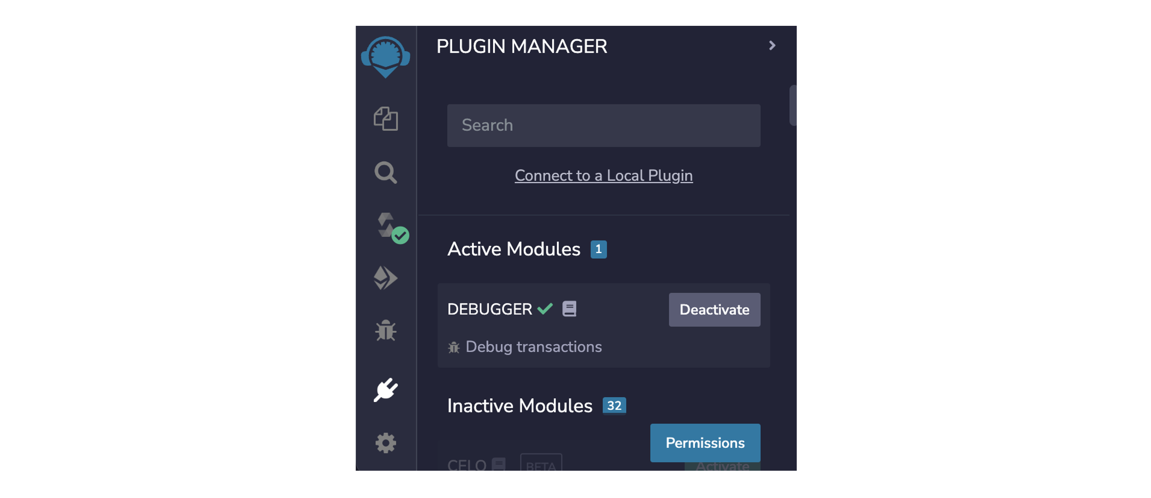Remix IDE는 플러그인을 기반으로 실행됩니다. 다양한 기능을 사용하려면 플러그인 관리자에서 모듈을 활성화해야 합니다. 아이콘 패널의 기본 모듈은 파일 탐색기, 컴파일, 배포 및 실행입니다.