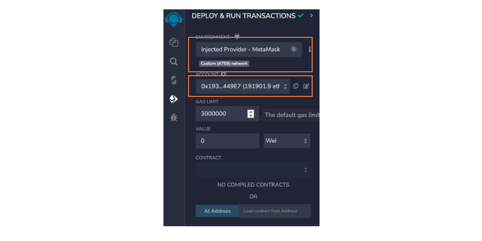 ENVIRONMENT : 개발 환경을 설정하는 부분으로 MEVerse 네트워크에 배포할 경우는 Injected Provider - MetaMask를 선택하여 MetaMask 지갑에 접속하여 진행합니다.