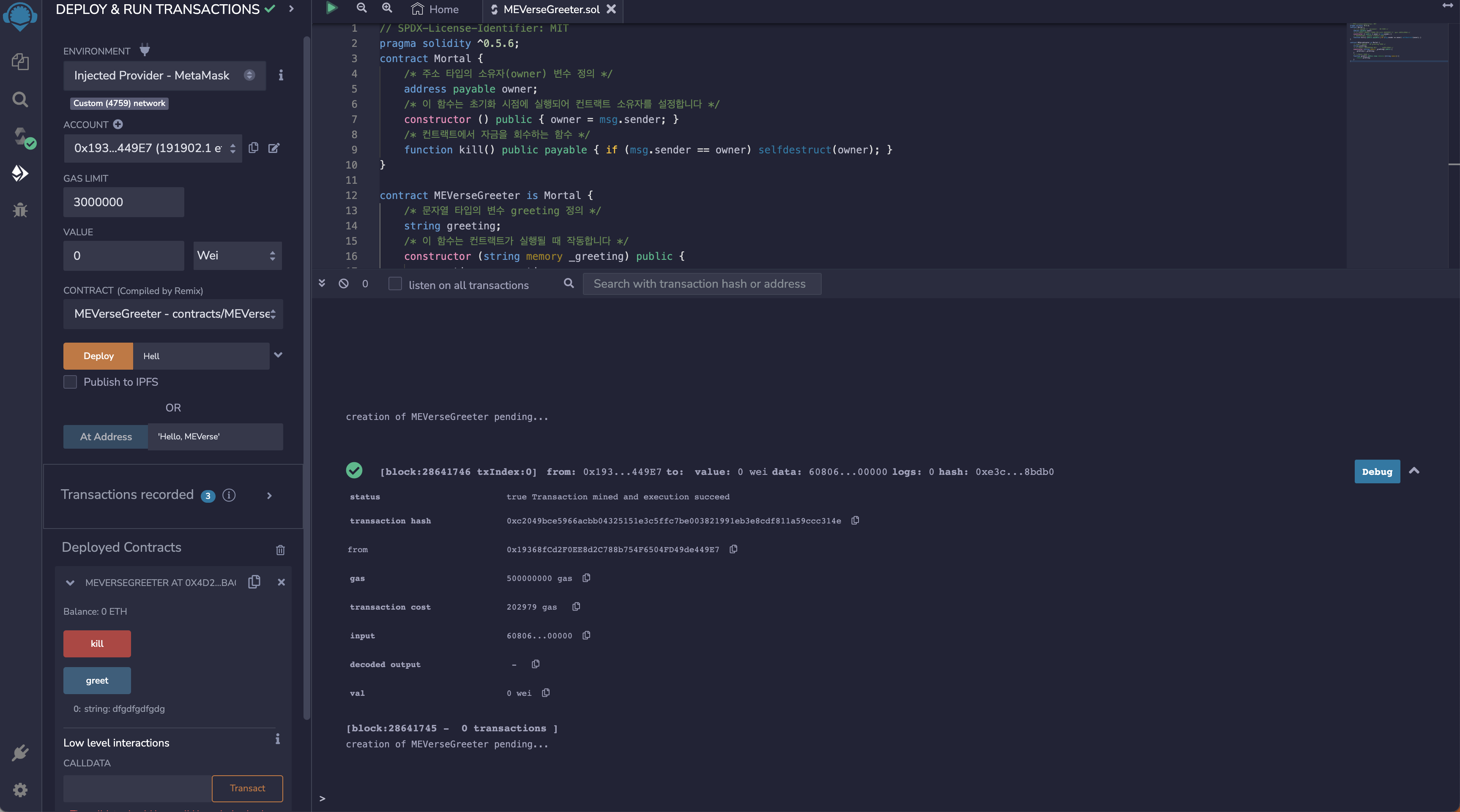 Transactions recorded와 Deployed Contract를 확인하여 정상적으로 배포 되었는지 확인이 가능합니다. greet라는 버튼을 클릭하여 스마트 컨트랙트 내의 greet함수를 호출하여 결과를 확인할 수 있습니다.