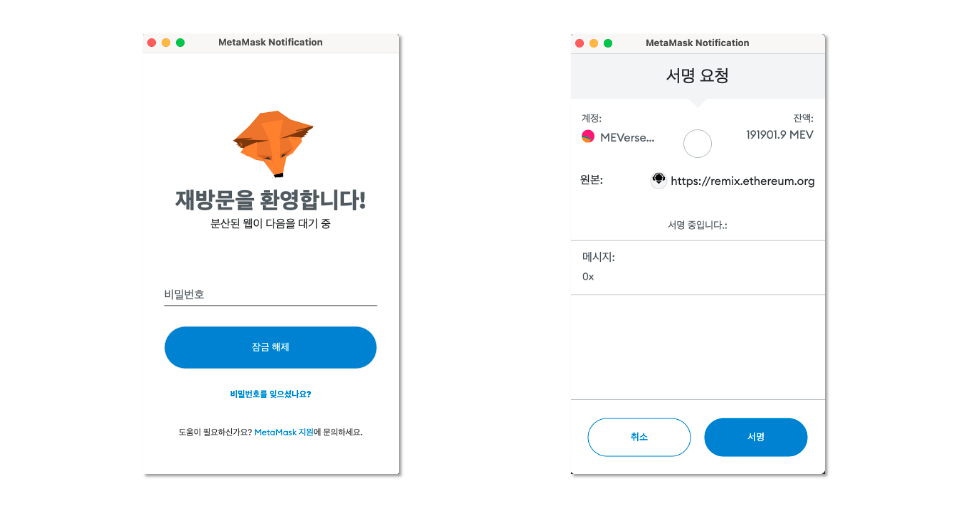 Injected Provider - MetaMask 연동 화면 Environment, Account, Contract를 확인한 다음 Deploy 버튼을 클릭하여 스마트 컨트랙트를 배포합니다. 메타 마스크에서 수수료에 대한 정보를 확인 한 다음 확인을 눌러 스마트 컨트랙트 배포를 완료합니다.