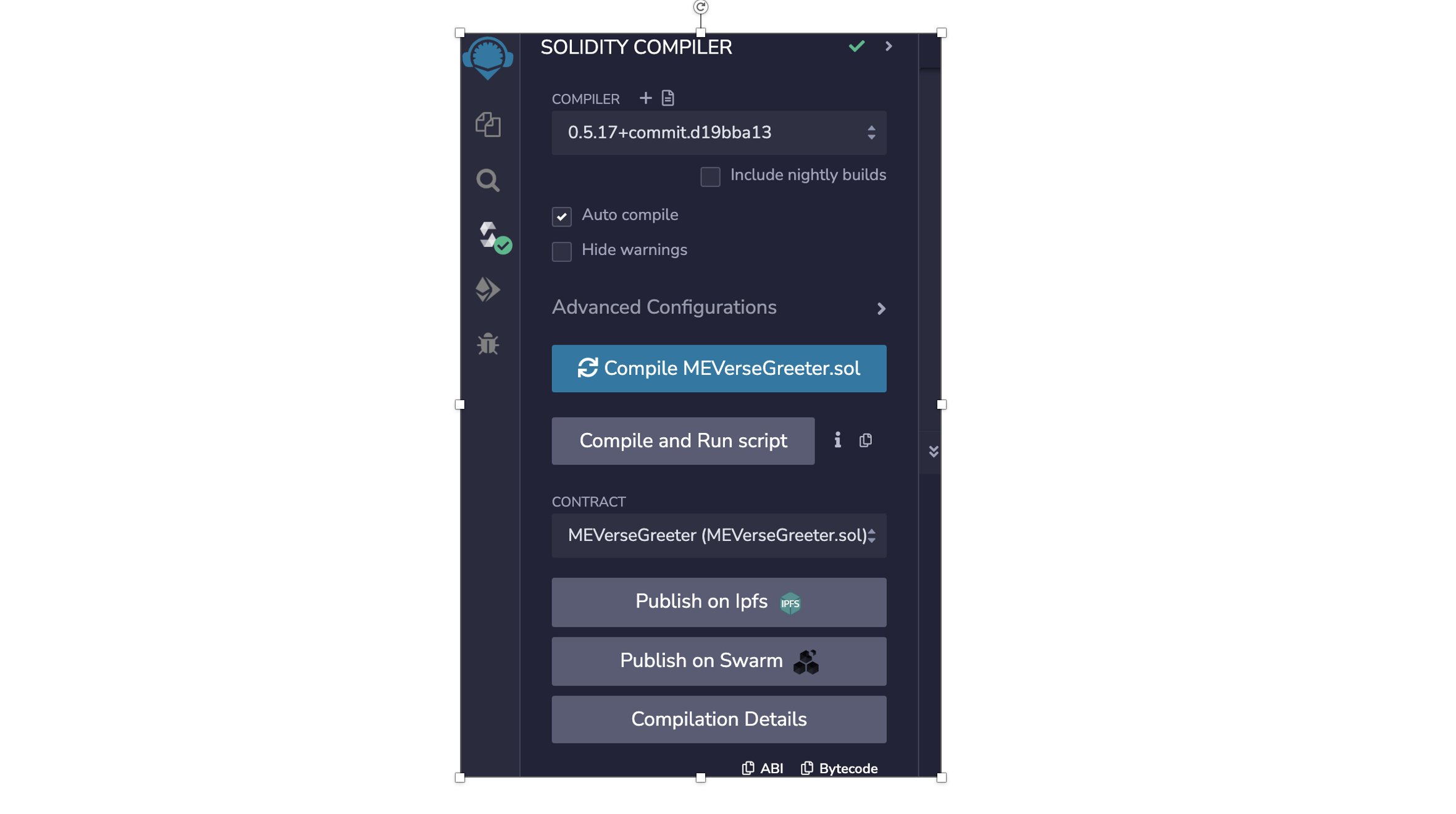 코드 작성을 마쳤으면 컴파일을 사용하여 오류 또는 경고를 확인합니다. 계약서를 작성한 후에야 배포할 수 있습니다.